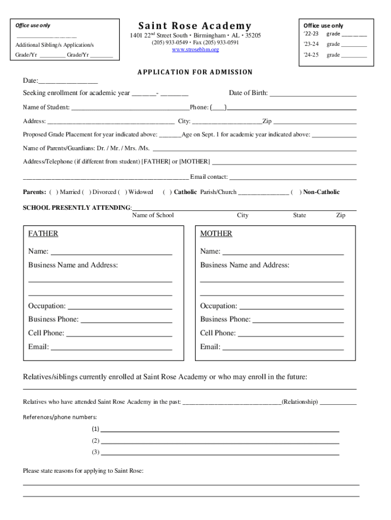 S an i n t RO s e Ac a d e office use OpenOffice use only1401 22 Street South Birmingham AL 352052223grade ___(205) 9330549 Fax (205) 9330591 www.strosebhm.org\'2324grade ___\'2425grade ___ND___ Additional
