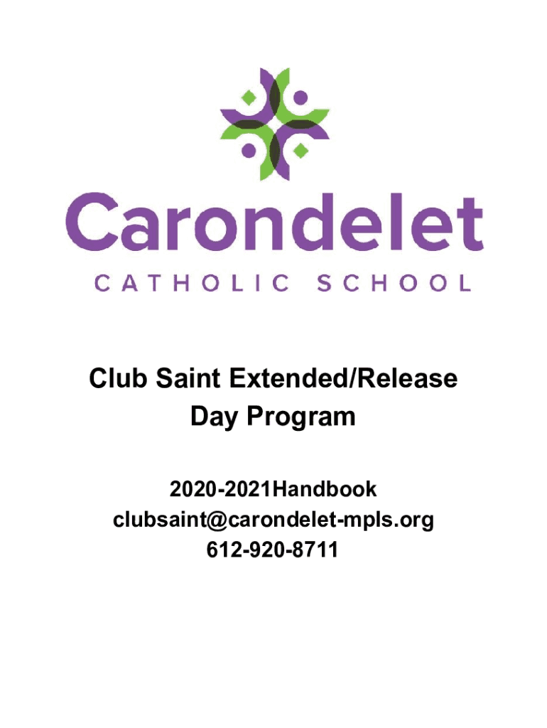 Club Saint Extended/Release Day Program 20202021Handbook clubsaint@carondeletmpls.org 6129208711Club Saint OverviewClub Saint, located on the Lower Campus, provides recreational and creative activities