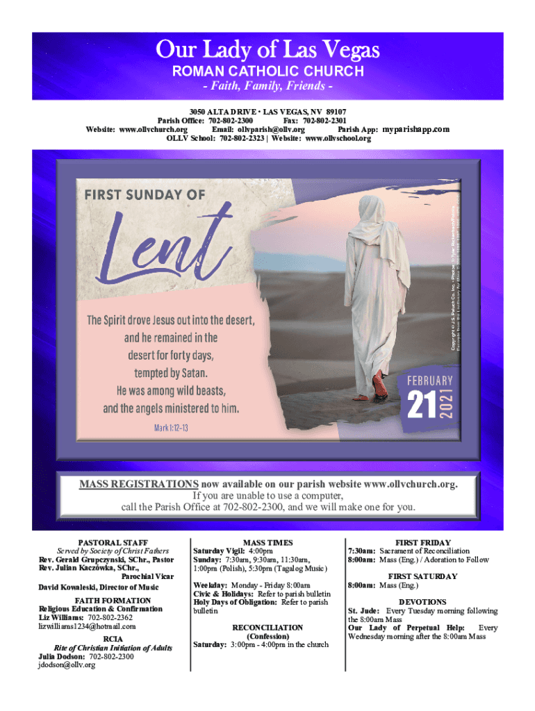 Our Lady of Las Vegas ROMAN CATHOLIC CHURCH Faith, Family, Friends 3050 ALTA DRIVE LAS VEGAS, NV 89107 Parish Office: 7028022300 Fax: 7028022301 Website: www.ollvchurch.org Email: ollvparish@ollv.org