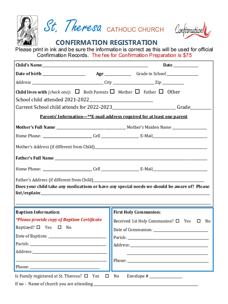 St. TheresaCATHOLIC CHURCHCONFIRMATION REGISTRATIONPlease print in ink and be sure the information is correct as this will be used for official