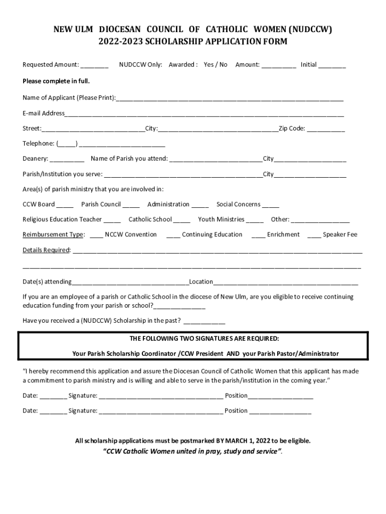 NEW ULM DIOCESAN COUNCIL OF CATHOLIC WOMEN (DCC) 20222023 SCHOLARSHIP APPLICATION FORM Requested Amount: ___DCC Only: Awarded : Yes / Amount: ___ Initial ___Please complete in full. Name of Applicant