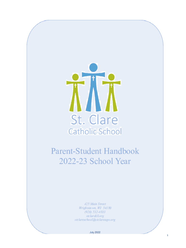 ParentStudent Handbook 202223 School Year425 Main Street Wrights town, WI 54180 (920) 5324833 stclarek8.org stclareschool@stclareagw.orgJuly 2022 1ContentsIntroduction to Saint Clare Catholic School7History7Letter