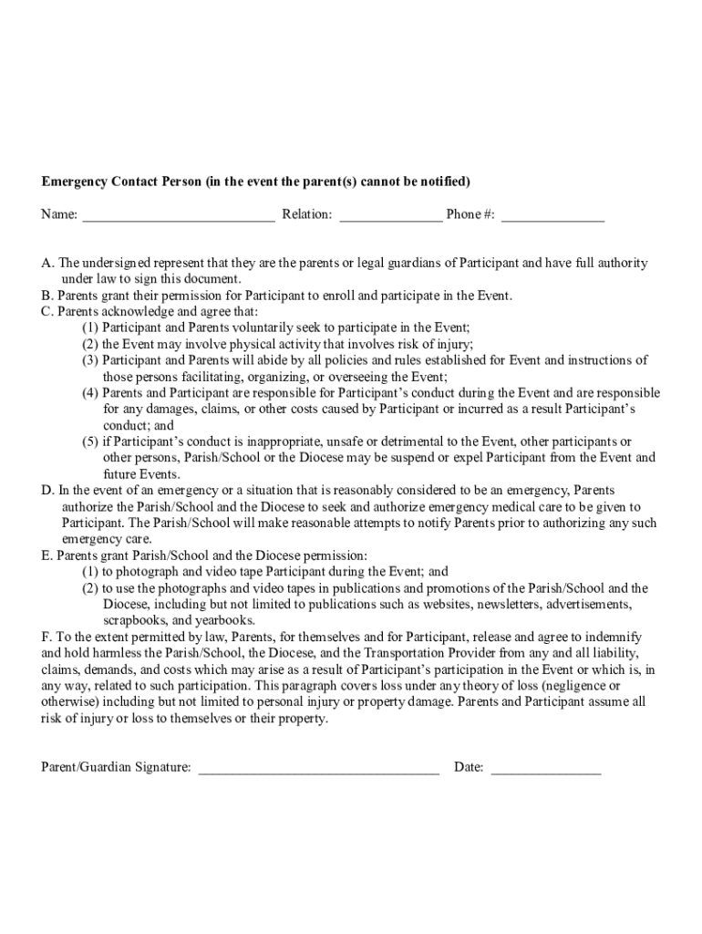 Emergency Contact Person (in the event the parent(s) cannot be notified) Name: ___ Relation: ___ Phone #: ___A. The undersigned represent that they are the parents or legal guardians of Participant