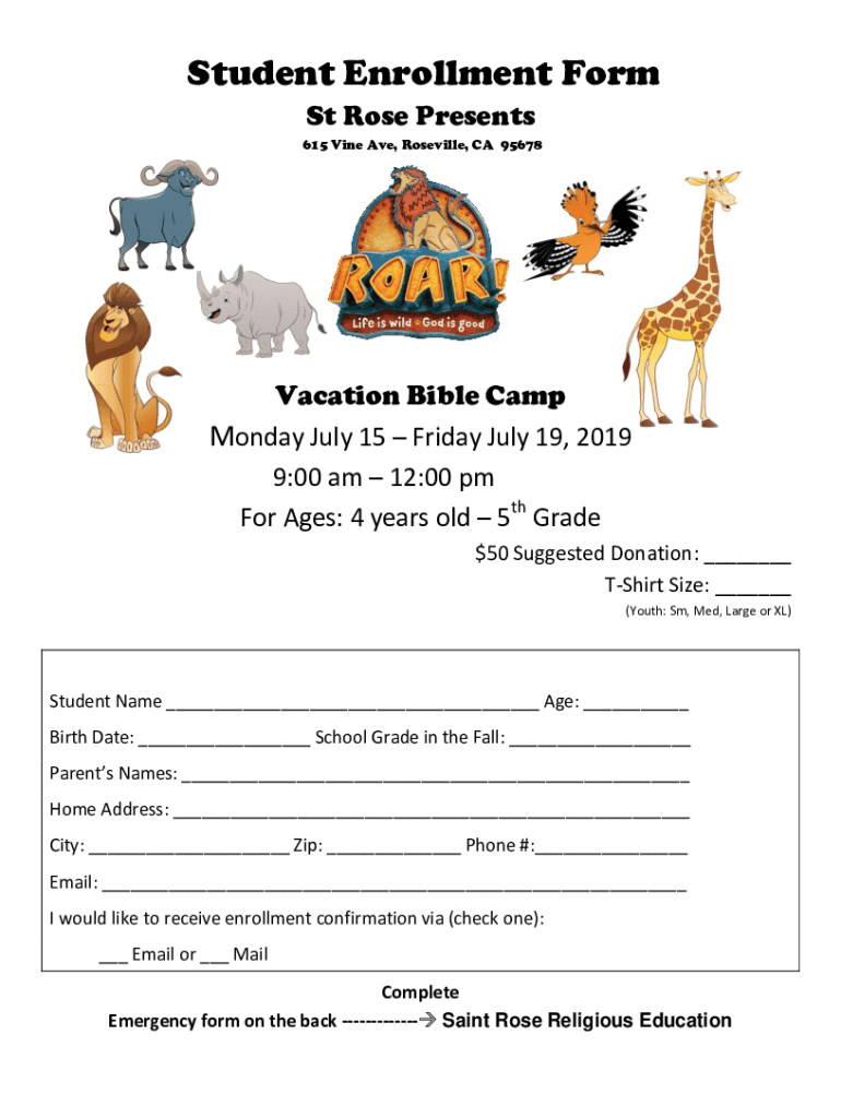 Student Enrollment Form St Rose Presents 615 Vine Ave, Roseville, CA 95678Vacation Bible Camp Monday, July 15 Friday, July 19, 2019 9:00 am 12:00 pm For Ages: 4 years old 5th Grade $50 Suggested Donation: