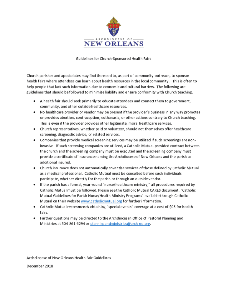 Guidelines for ChurchSponsored Health Fairs Church parishes and postulates may find the need to, as part of community outreach, to sponsor health fairs where attendees can learn about health resources