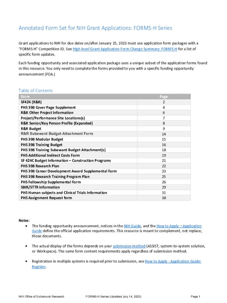 Annotated Form Set for NIH Grant Applications: FORMS Series Grant applications to NIH for due dates on/after January 25, 2023, must use application form packages with a FORMS Competition ID. See High