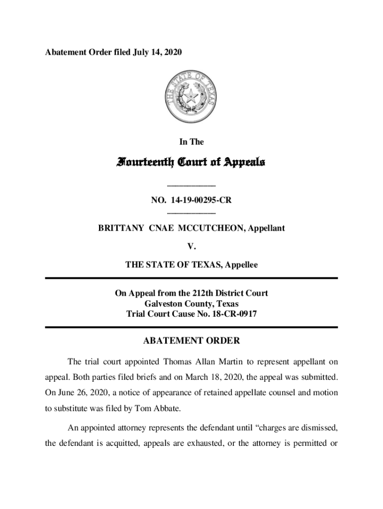 Abatement Order filed July 14, 2020In Fourteenth Court of Appeals ___NO. 141900295CR ___BRITTANY CNE ESCUTCHEON, Appellant V. THE STATE OF TEXAS, Appealed On Appeal from the 212th District Court Galveston