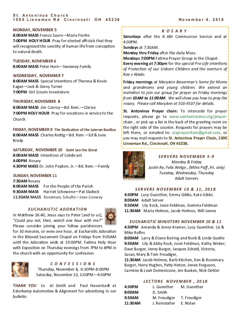 St. Antoninus Church 1500 Lineman Rd CincinnatiOH45238MONDAY, NOVEMBER 5 8:00AM MASS Franco Samaria Frito 7:00PM HOLY HOUR Pray for elected officials that they will recognize the sanctity of human