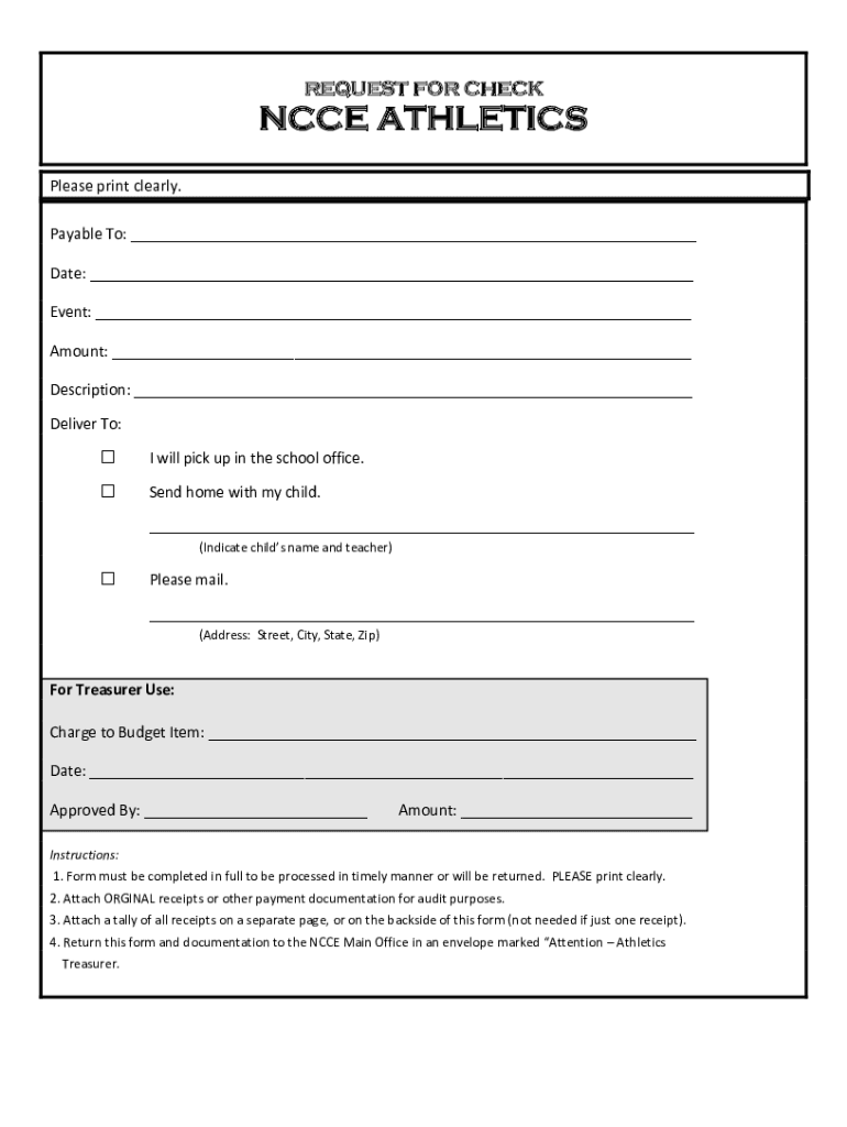 REQUEST FOR CHECKMATE ATHLETICS Please print clearly. Payable To: ___ Date: ___ Event: ___ Amount: ___ Description: ___ Deliver To: I will pick up in the school office. Send home with my child. ___