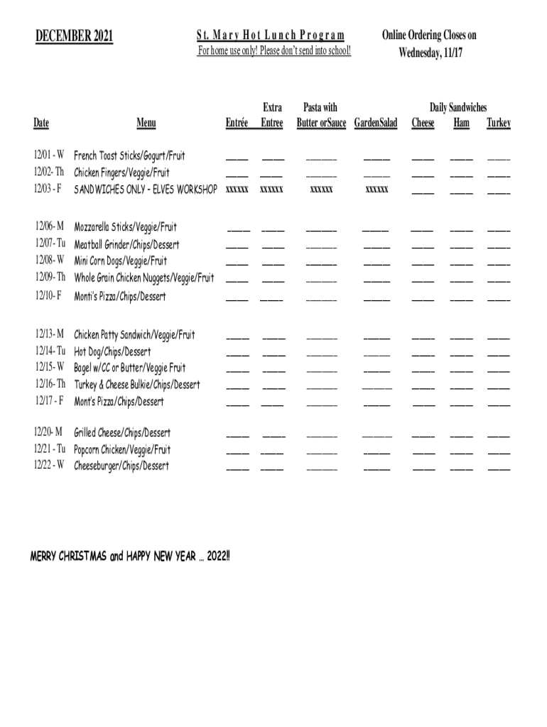 S t. M an r y H o t L u n c h P r o g r a December 2021For home use only! Please don't send into school! Online Ordering Closes on Wednesday, 11/17MenuEntreExtra EntreePasta with Butter orSauceGardenSalad12/01