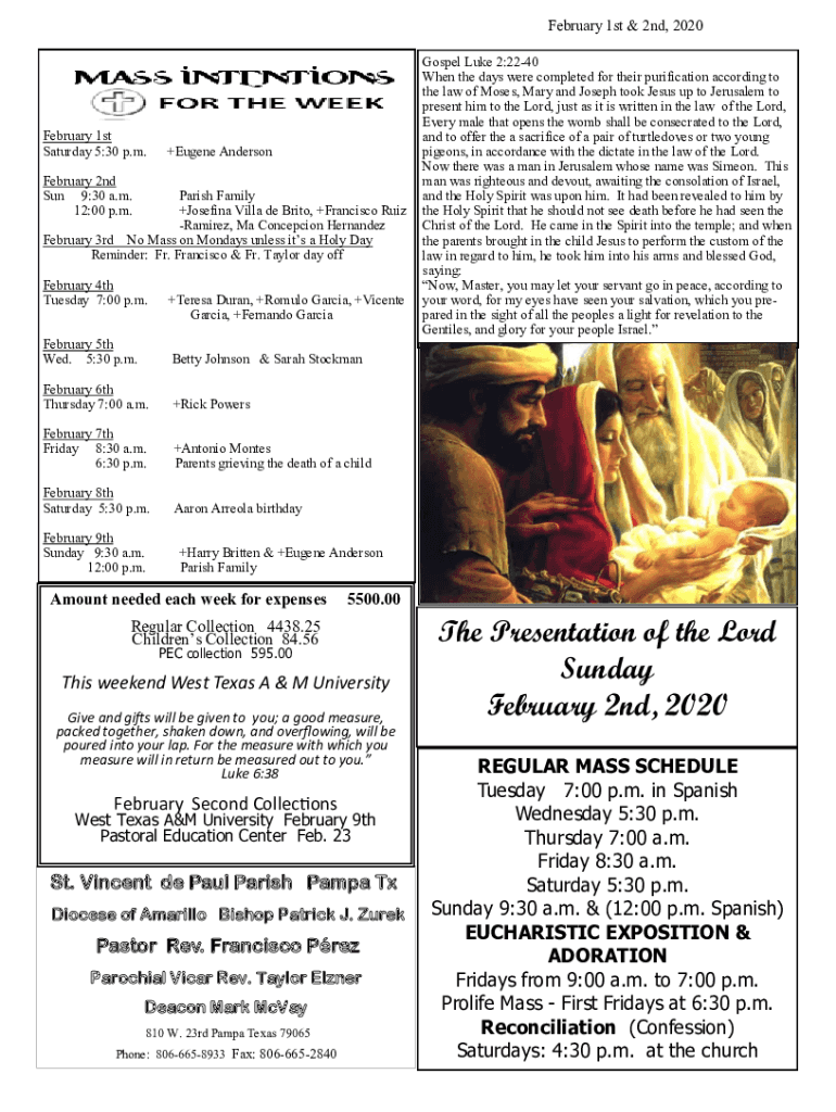 February 1st & 2nd, 2020February 1st Saturday 5:30 p.m.+Eugene Anderson February 2nd Sun 9:30 a.m. 12:00 p.m. Parish Family +Josefina Villa de Brito, +Francisco Ruiz Ramirez, Ma Concepcion Hernandez