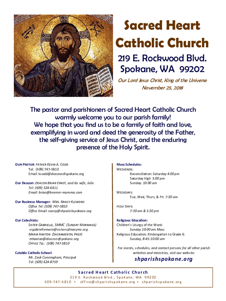 Sacred Heart Catholic Church 219 E. Lockwood Blvd. Spokane, WA 99202 Our Lord Jesus Christ, King of the Universe November 25, 2018The pastor and parishioners of Sacred Heart Catholic Church warmly
