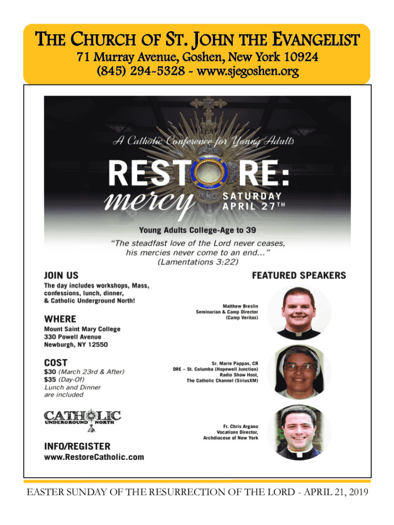 THE CHURCH OF ST. JOHN THE EVANGELIST 71 Murray Avenue, Goshen, New York 10924 (845) 2945328 www.sjegoshen.orgEASTER SUNDAY OF THE RESURRECTION OF THE LORD APRIL 21, 2019The Church of St. John the