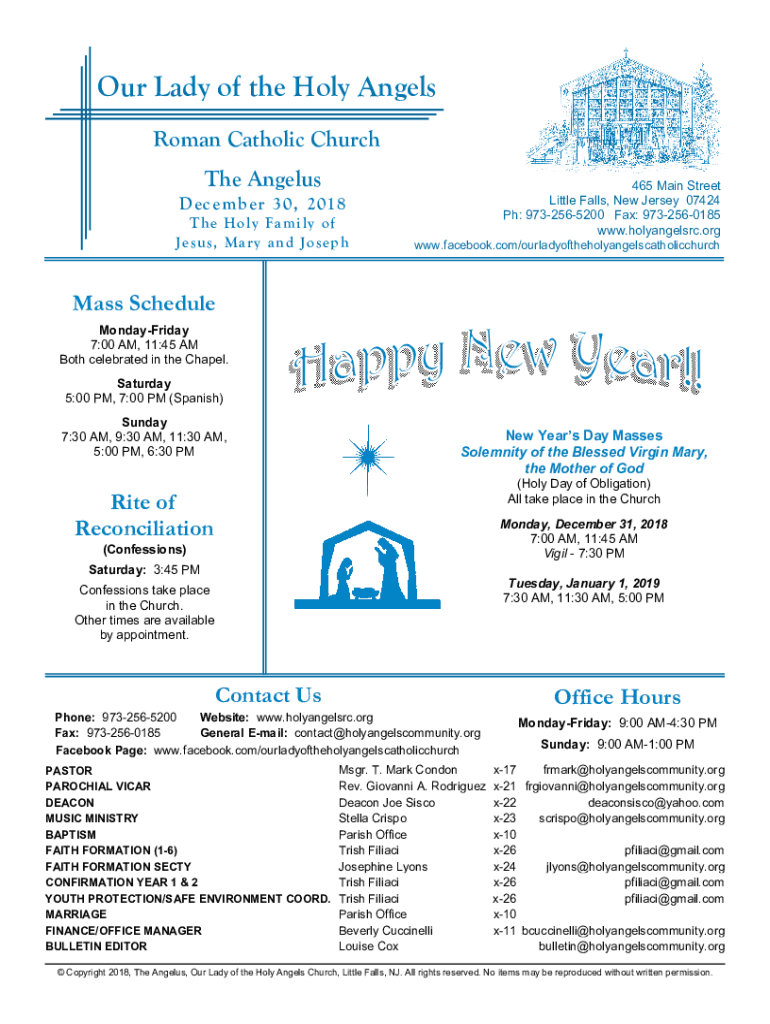 Our Lady of the Holy Angels Roman Catholic Church The Angelus465 Main Street Little Falls, New Jersey 07424 pH: 9732565200 Fax: 9732560185 www.holyangelsrc.orgD e c e m b e r 3 0, 2 018 The Holy Family