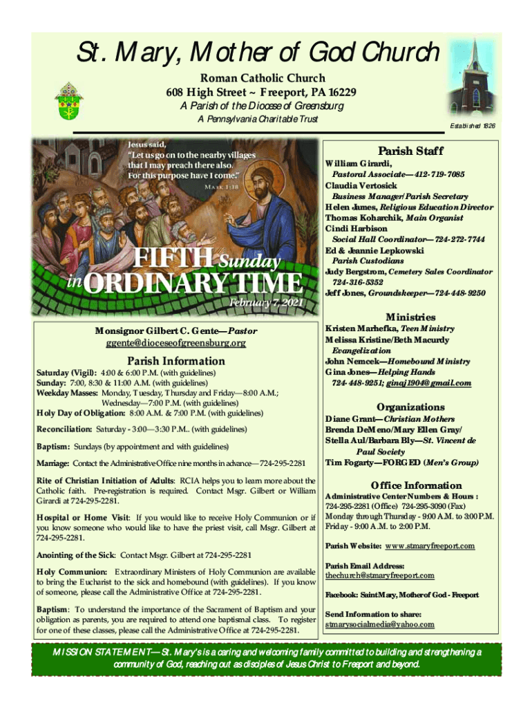St. Mary, Mother of God Church Roman Catholic Church 608 High Street Freeport, PA 16229 A Parish of the Diocese of Greensburg A Pennsylvania Charitable TrustEstablished 1826Parish Staff William Girard,
