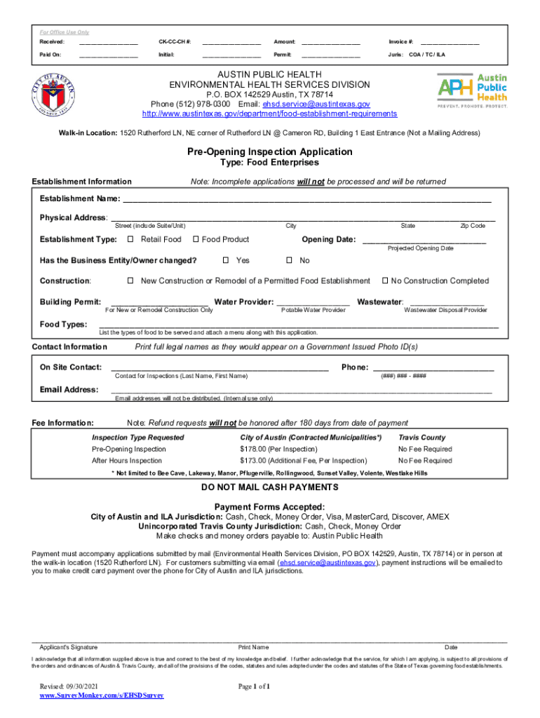For Office Use Only Received:___CHURCH #:___Amount:___Invoice #:Paid On:___Initial:___Permit:___Juries:___COA / TC / AUSTIN PUBLIC HEALTH ENVIRONMENTAL HEALTH SERVICES DIVISION P.O. BOX 142529 Austin,