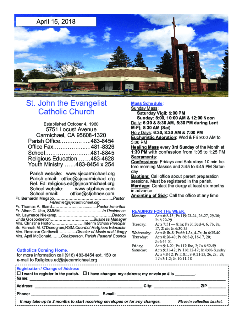 April 15, 2018St. John the Evangelist Catholic Church Established October 4, 19605751 Locust Avenue Carmichael, CA 956081320 Parish Office.4838454 Office Fax...4818326 School.4818845 Religious Education.