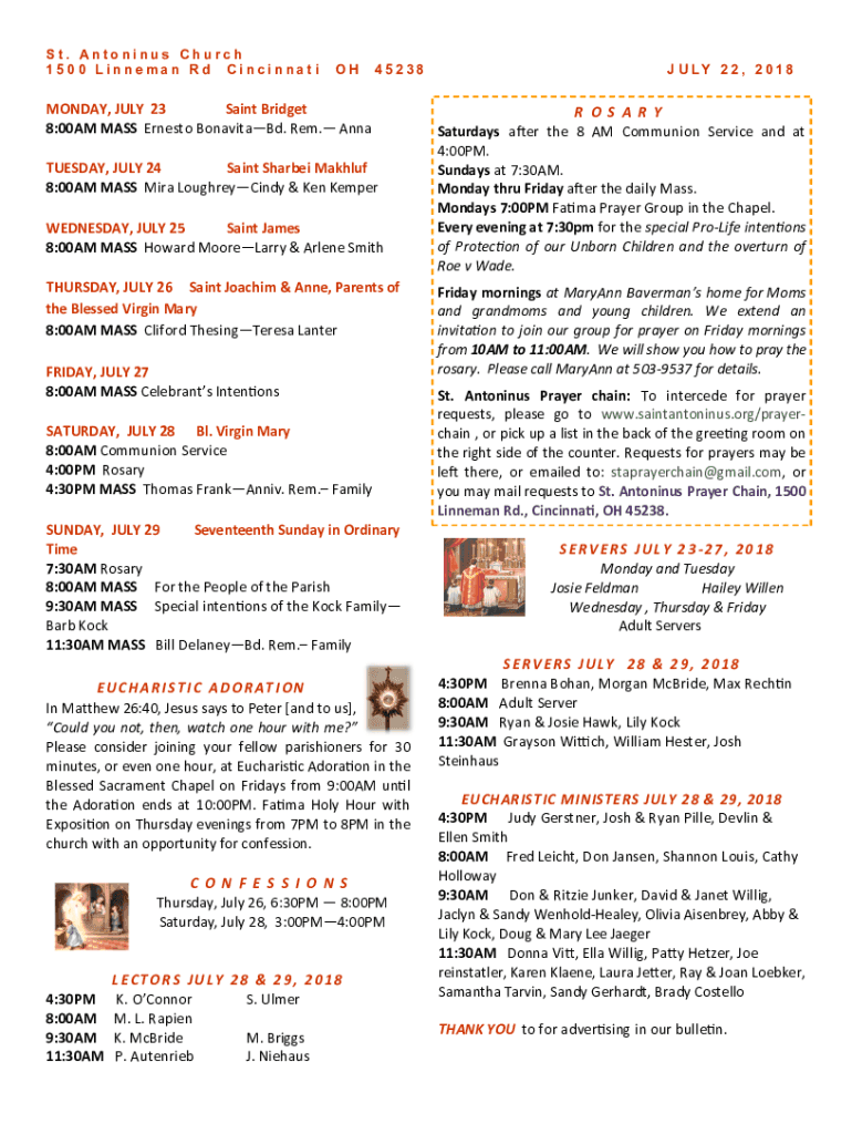 St. Antoninus Church 1500 Lineman Rd CincinnatiOH45238MONDAY, JULY 23 Saint Bridget 8:00AM MASS Ernesto BonavitaBd. Rem. Anna TUESDAY, JULY 24 Saint Sharia Makeup 8:00AM MASS Mira LoughreyCindy &