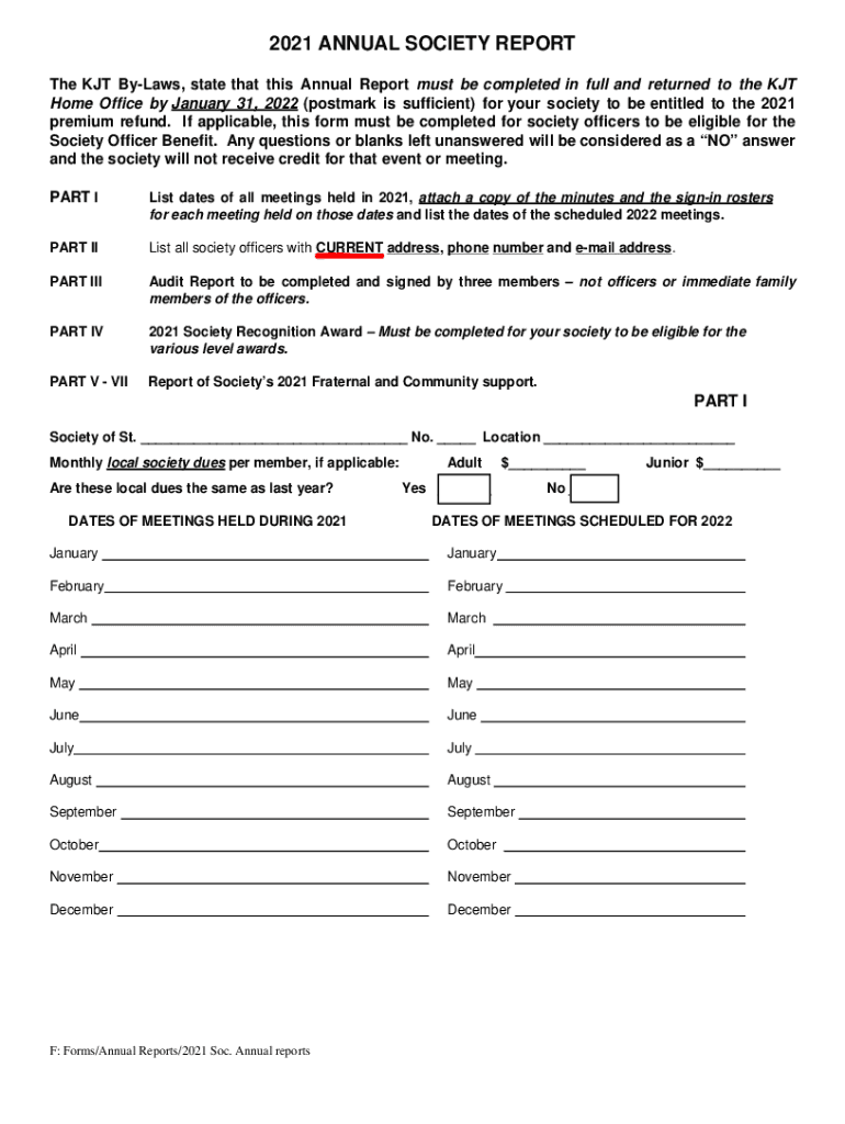2021 ANNUAL SOCIETY REPORT The KIT Bylaws, state that this Annual Report must be completed in full and returned to the KIT Home Office by January 31, 2022 (postmark is sufficient) for your society