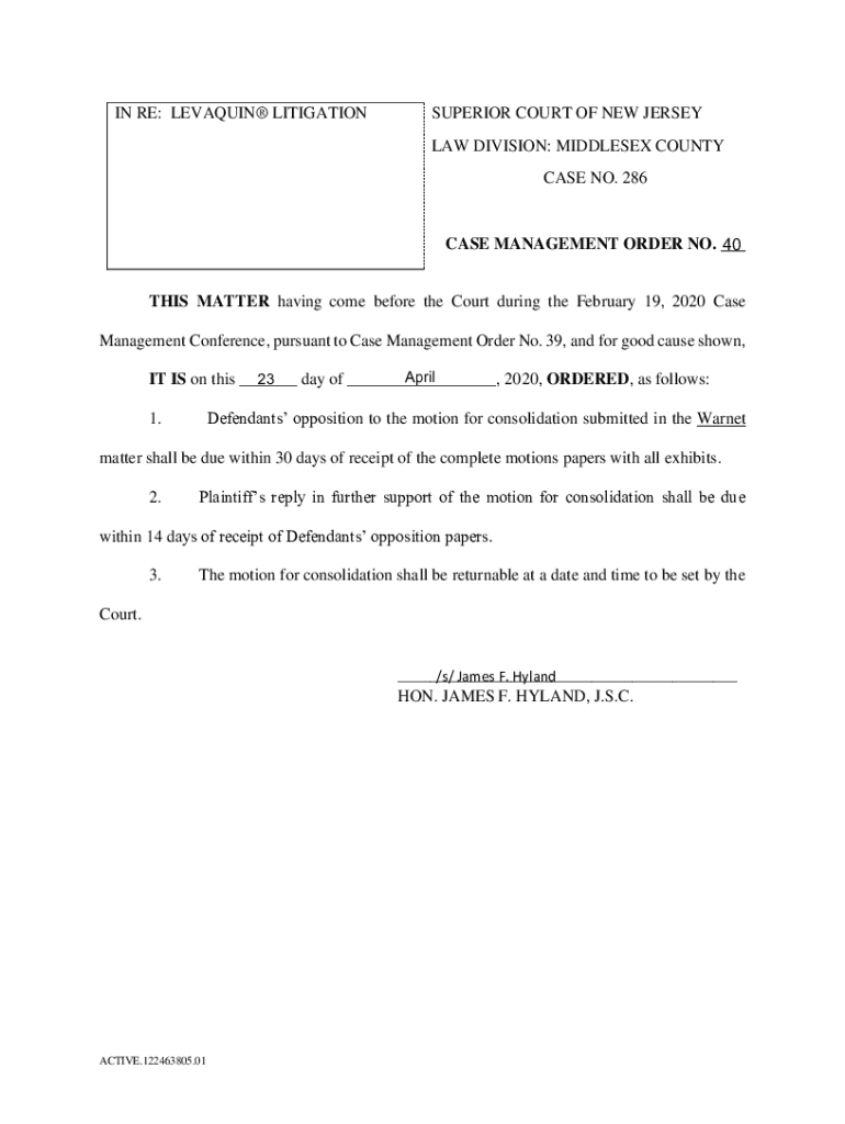 IN RE: LITIGATIONSUPERIOR COURT OF NEW JERSEY LAW DIVISION: MIDDLESEX COUNTY CASE NO. 286CASE MANAGEMENT ORDER NO. ___ 40 THIS MATTER having come before the Court during the February 19, 2020, Case