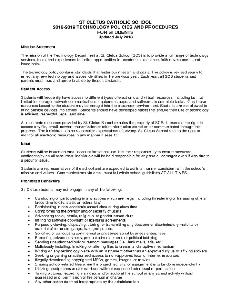 ST CETUS CATHOLIC SCHOOL 20182019 TECHNOLOGY POLICIES AND PROCEDURES FOR STUDENTS Updated July 2018 Mission Statement The mission of the Technology Department at St. Cetus School (SCS) is to provide
