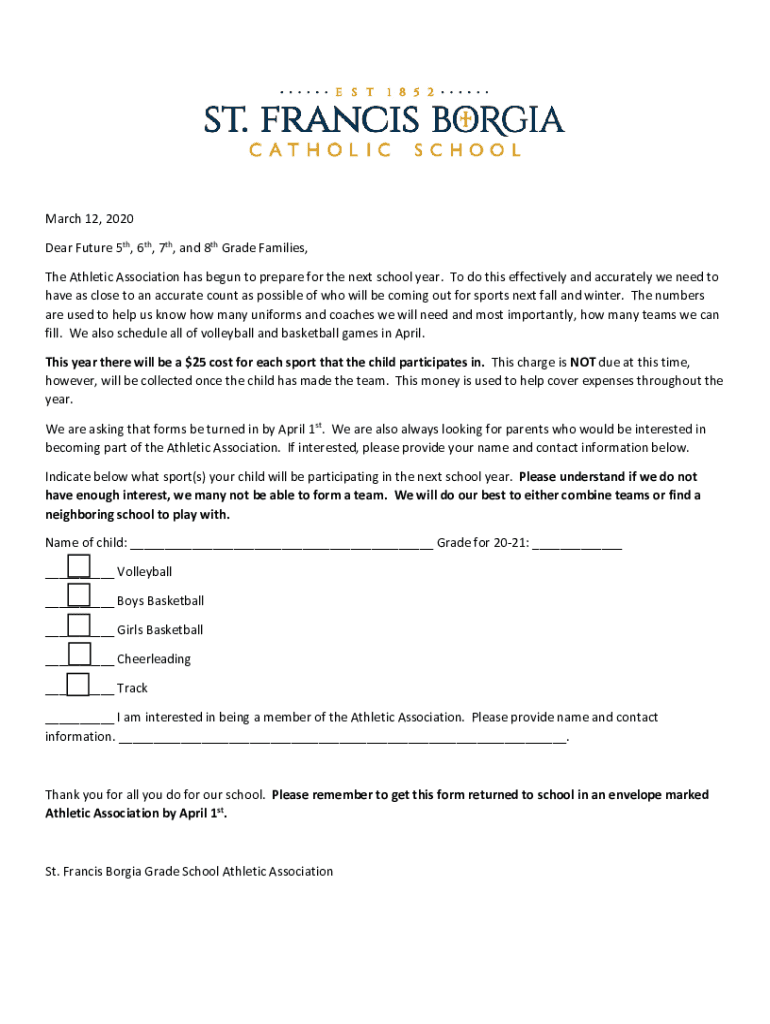 March 12, 2020, Dear Future 5th, 6th, 7th, and 8th Grade Families, The Athletic Association has begun to prepare for the next school year. To do this effectively, and accurately we need to have as