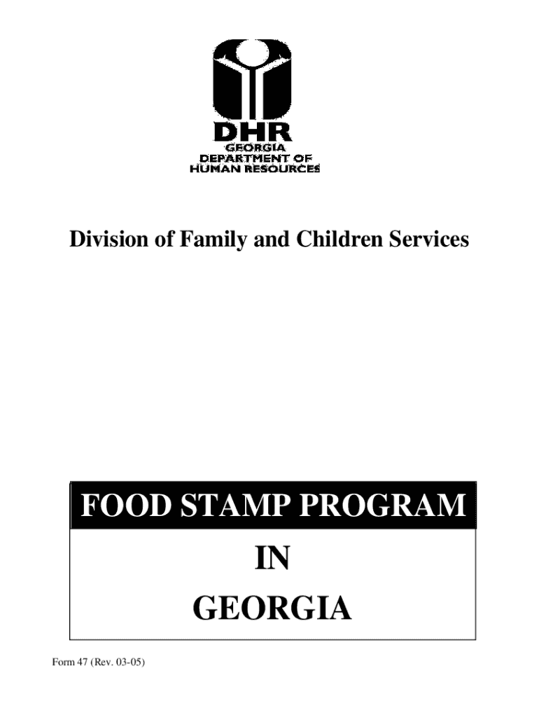 Division of Family and Children ServicesFOOD STAMP PROGRAM IN GEORGIA Form 47 (Rev. 0305)THE FOOD STAMP PROGRAM IN GEORGIA WHAT IS THE FOOD STAMP PROGRAM? The food stamp program provides monthly benefits