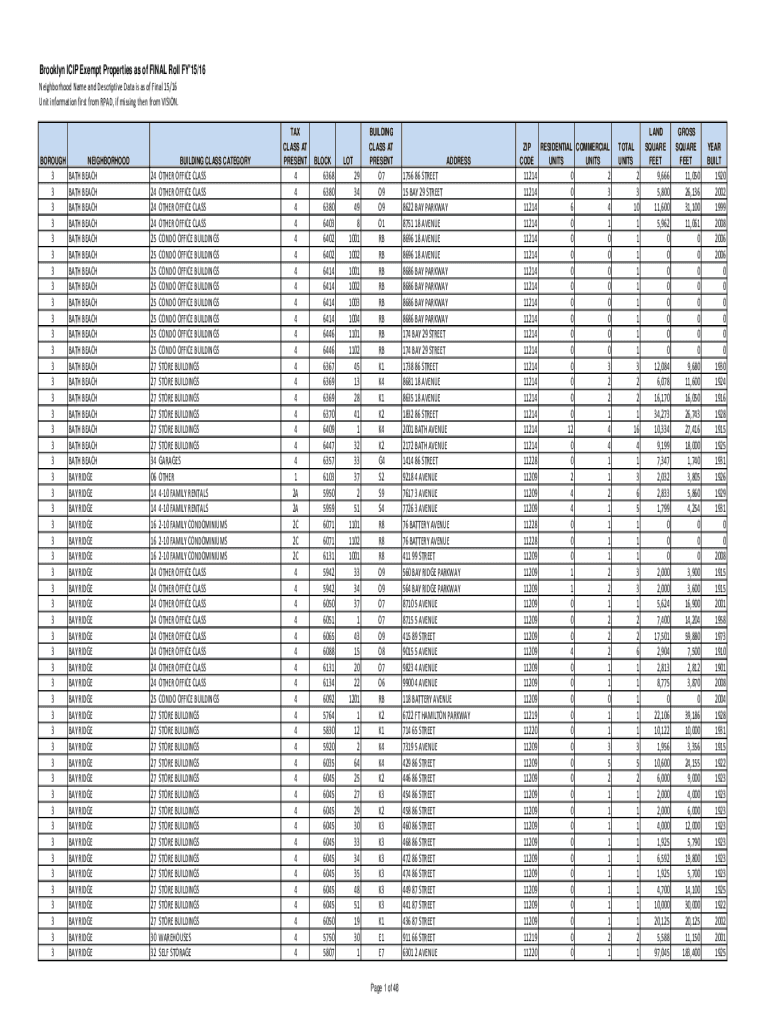 Brooklyn ICP Exempt Properties as of FINAL Roll FY\'15/16 Neighborhood Name and Descriptive Data is as of Final 15/16 Unit information first from ROAD, if missing then from VISION.BOROUGH3 3 3 3 3