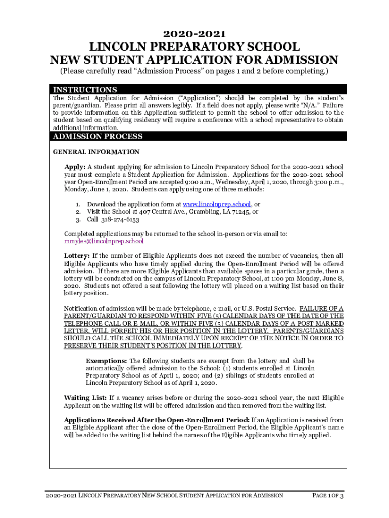 20202021 LINCOLN PREPARATORY SCHOOL NEW STUDENT APPLICATION FOR ADMISSION (Please carefully read Admission Process on pages 1 and 2 before completing.) INSTRUCTIONS The Student Application for Admission