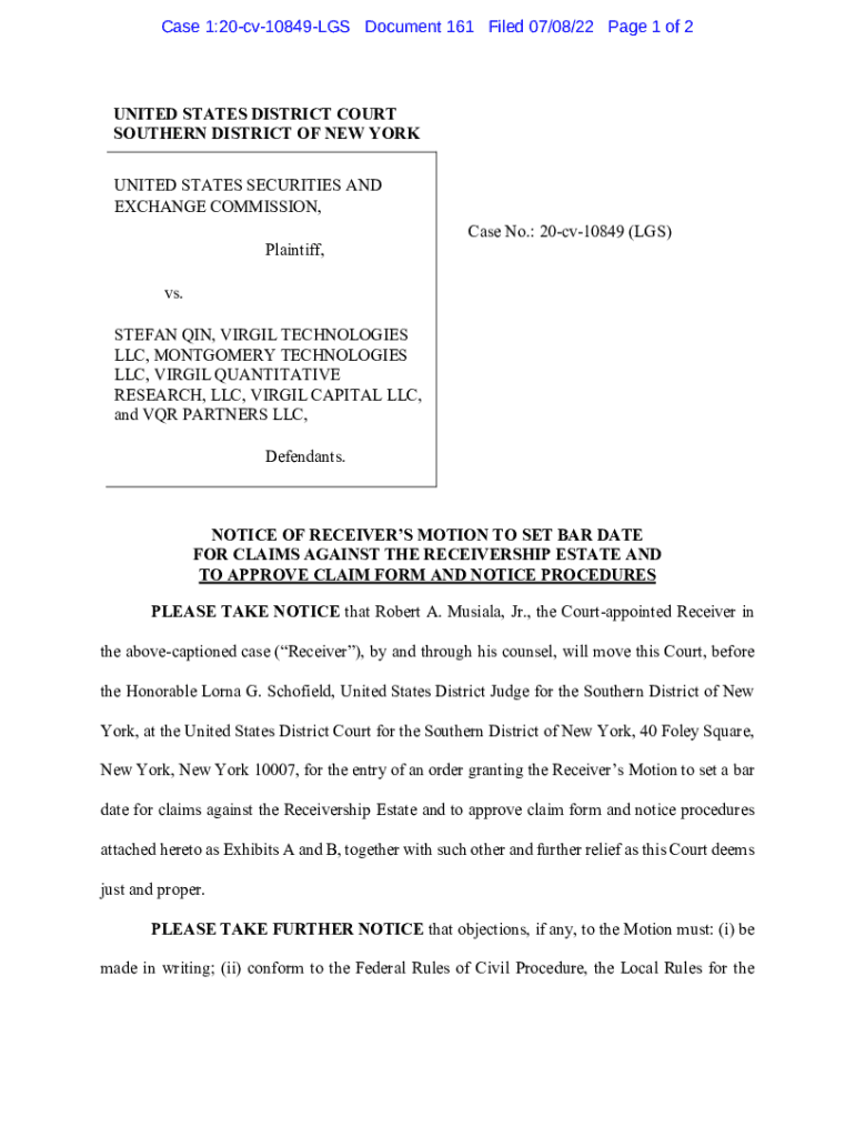 Case 1:20cv10849LGS Document 161 Filed 07/08/22-Page 1 of 2UNITED STATES DISTRICT COURT SOUTHERN DISTRICT OF NEW YORK UNITED STATES SECURITIES AND EXCHANGE COMMISSION, Plaintiff, Case No.: 20cv10849
