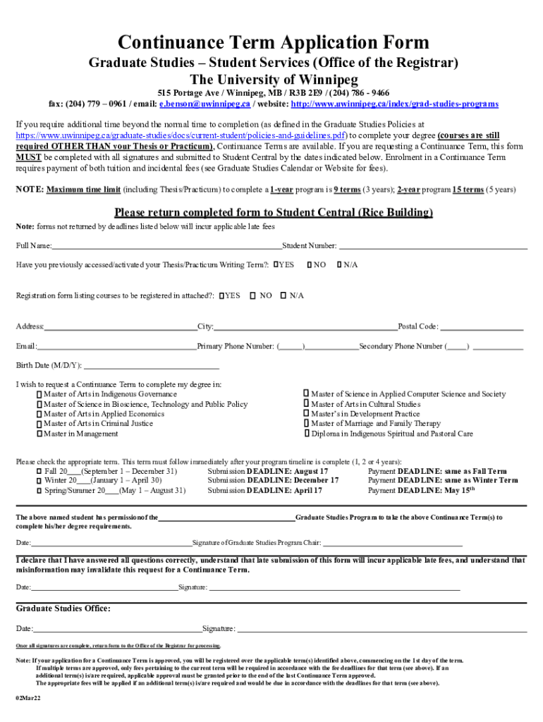 Get the free APPLICATION FOR CONTINUANCE - University of Winnipeg