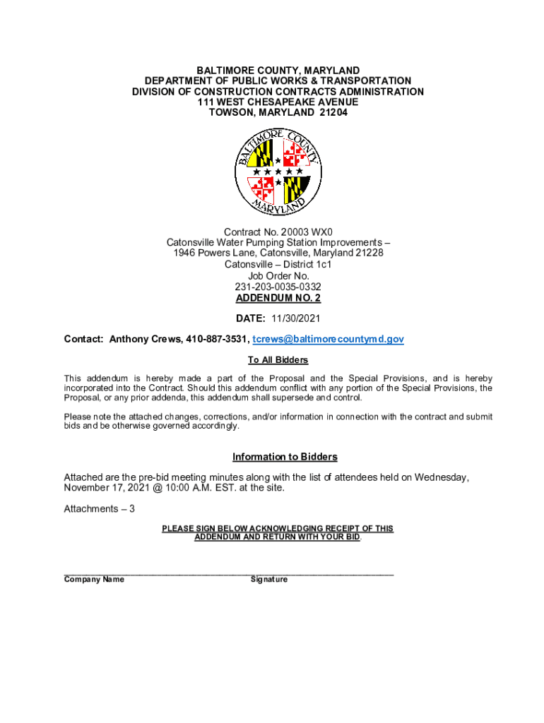 BALTIMORE COUNTY, MARYLAND DEPARTMENT OF PUBLIC WORKS & TRANSPORTATION DIVISION OF CONSTRUCTION CONTRACTS ADMINISTRATION 111 WEST CHESAPEAKE AVENUE TOWSON, MARYLAND 21204Contract No. 20003 WX0 Catonsville