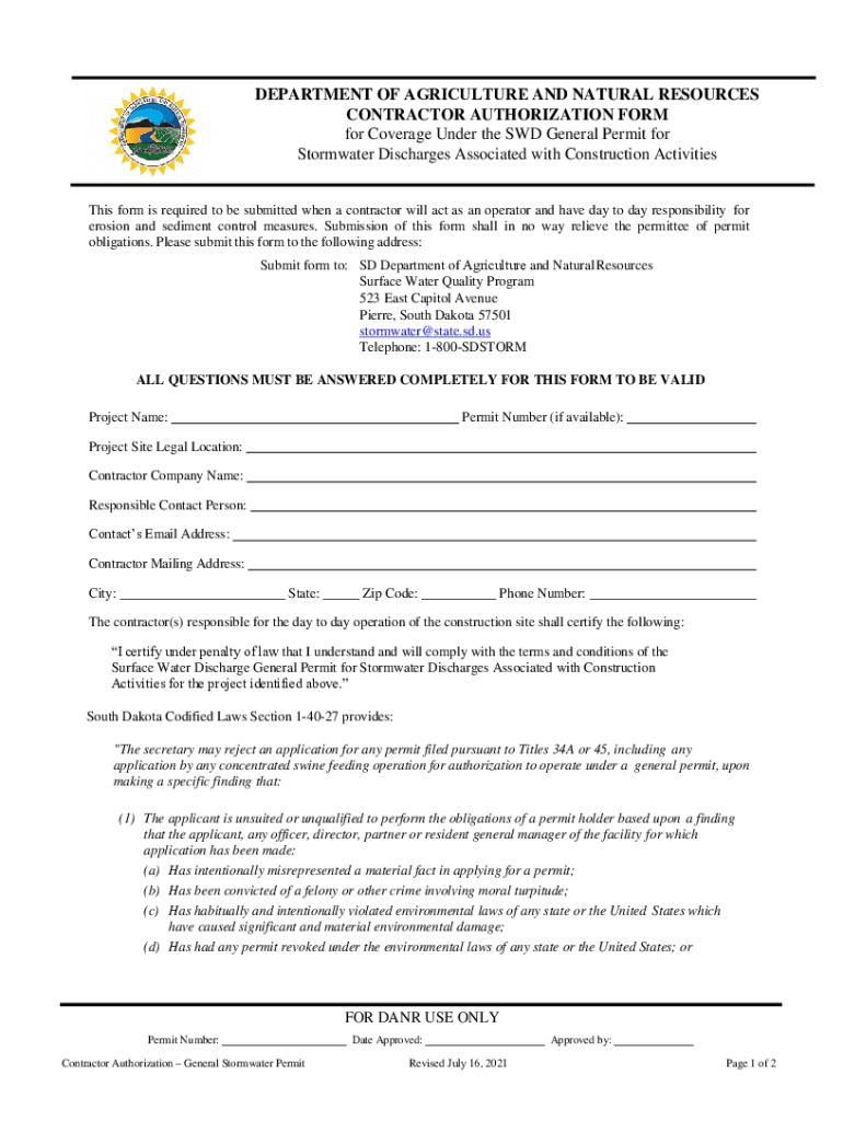 DEPARTMENT OF AGRICULTURE AND NATURAL RESOURCES CONTRACTOR AUTHORIZATION FORM for Coverage Under the SD General Permit for Stormwater Discharges Associated with Construction Activities This form is