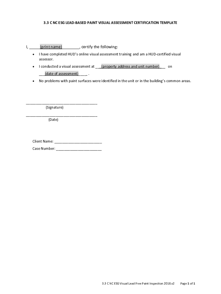 3.3 C NC ESG LEASED PAINT VISUAL ASSESSMENT CERTIFICATION TEMPLATE, ___(print name)___, certify the following: I have completed HUD's online visual assessment training and am a HUD certified visual