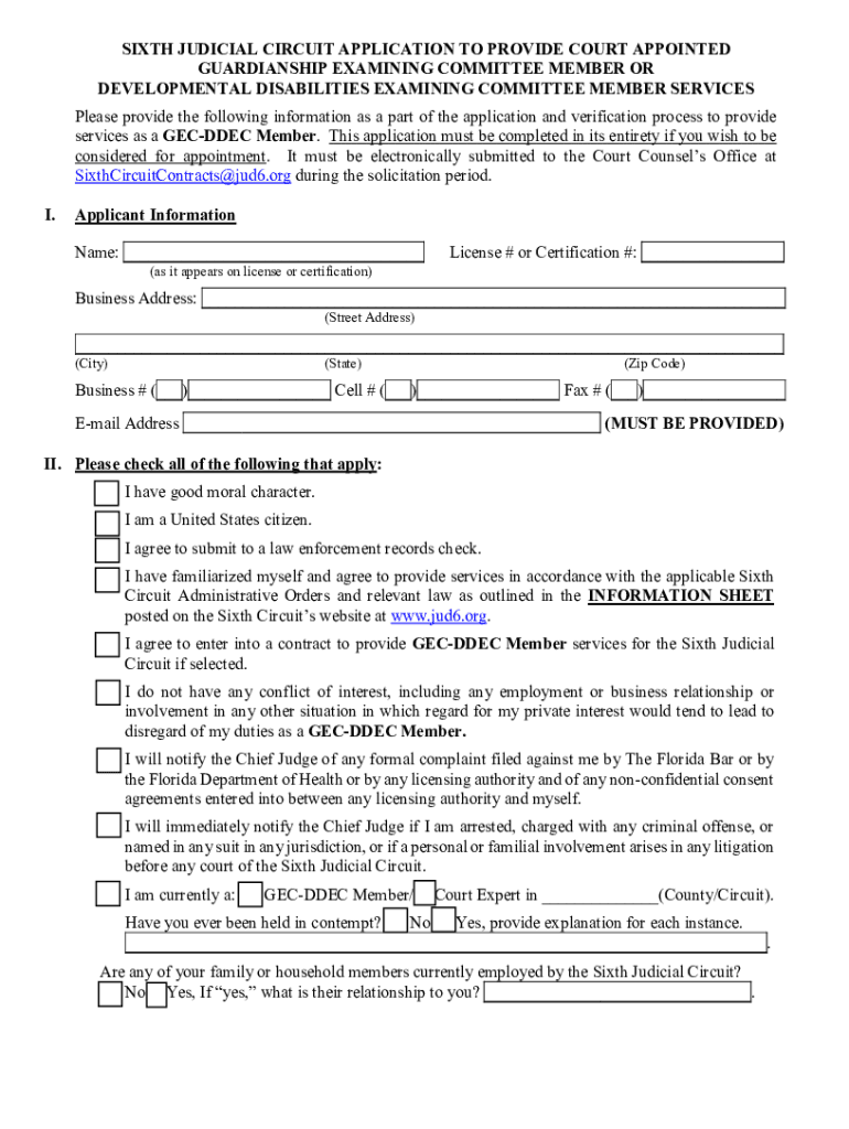 SIXTH JUDICIAL CIRCUIT APPLICATION TO PROVIDE COURT APPOINTED GUARDIANSHIP EXAMINING COMMITTEE MEMBER OR DEVELOPMENTAL DISABILITIES EXAMINING COMMITTEE MEMBER SERVICES Please provide the following