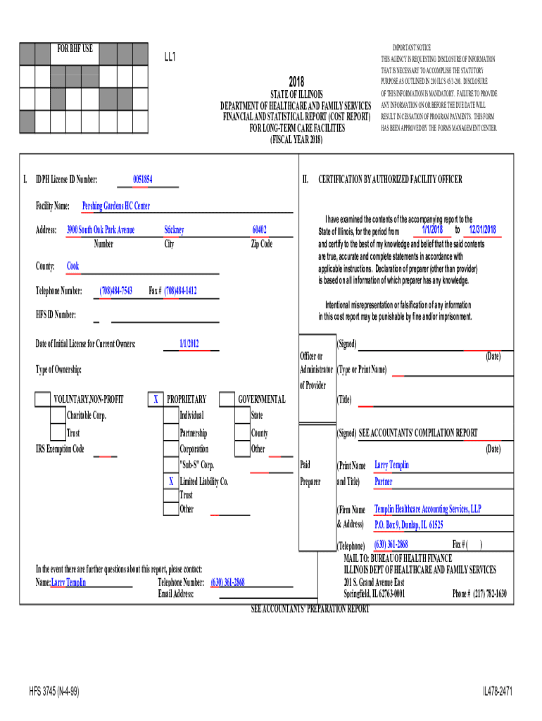 FOR BHF USELL1 2018STATE OF ILLINOIS DEPARTMENT OF HEALTHCARE AND FAMILY SERVICES FINANCIAL AND STATISTICAL REPORT (COST REPORT) FOR LONGER CARE FACILITIES (FISCAL YEAR 2018) I.DPH License ID Number: