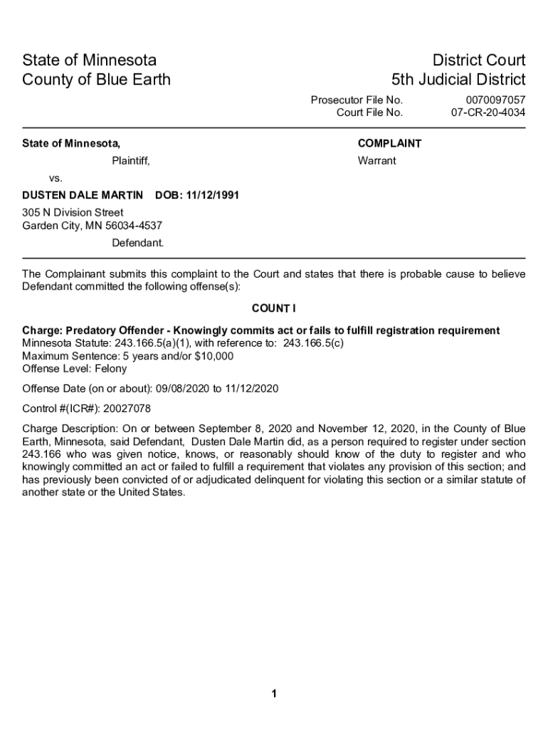 StateofMinnesota CountyofBlueEarthDistrictCourt 5thJudicialDistrict ProsecutorFileNo. CourtFileNo. StateofMinnesota,0070097057 07CR204034COMPLAINTPlaintiff,Warrants. DUSTENDALEMARTINDOB:11/12/1991