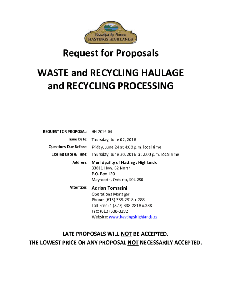 Request for Proposals WASTE and RECYCLING HAULAGE and RECYCLING PROCESSINGREQUEST FOR PROPOSAL: HH201604 Issue Date: Thursday, June 02, 2016, Questions Due Before: Friday, June 24 at 4:00 p.m. local