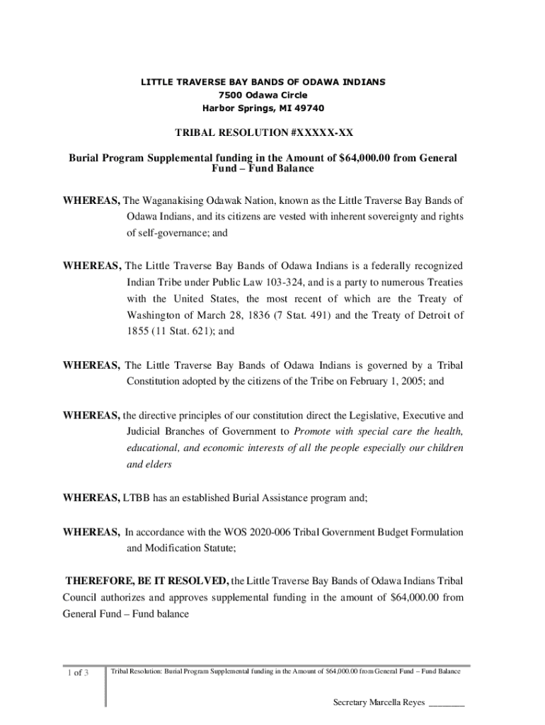 LITTLE TRAVERSE BAY BANDS OF OD AWA INDIANS 7500 Data Circle Harbor Springs, MI 49740TRIBAL RESOLUTION #XXXXXXXBurial Program Supplemental funding in the Amount of $64,000.00 from General Fund Balance