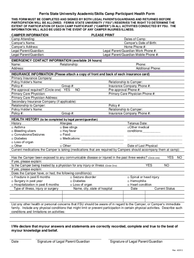 Ferris State University Academic/Skills Camp Participant Health Form THIS FORM MUST BE COMPLETED AND SIGNED BY BOTH LEGAL PARENTS/GUARDIANS AND RETURNED BEFORE PARTICIPATION WILL BE ALLOWED. FERRIS