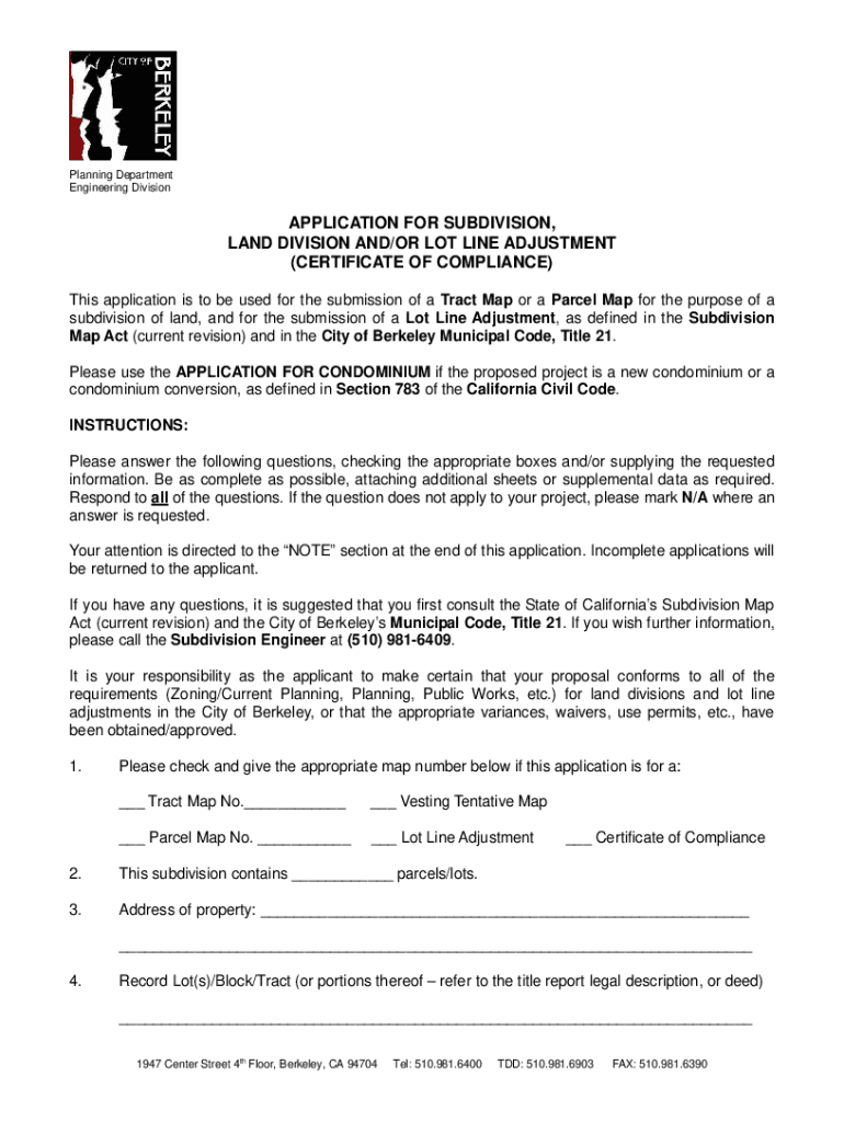 Planning Department Engineering Divisionalization FOR SUBDIVISION, LAND DIVISION AND/OR LOT LINE ADJUSTMENT (CERTIFICATE OF COMPLIANCE) This application is to be used for the submission of a Tract