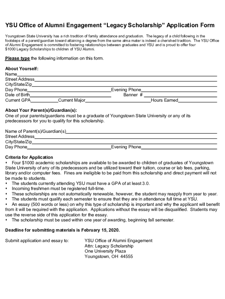 Suffice of AlumniEngagementLegacyScholarshipApplicationForm YoungstownStateUniversityhasarichtraditionoffamilyattendanceandgraduation. Thelegacyof achildfollowinginthe footsteps of apart/guardiantowardattainingadegreefromthesamealmamaterisindeedacherishedtradition.