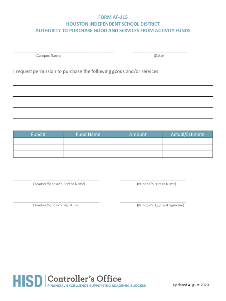 FORM AF115 HOUSTON INDEPENDENT SCHOOL DISTRICT AUTHORITY TO PURCHASE GOOD AND SERVICES FROM ACTIVITY FUNDS ___ (Campus Name)___ (Date)I request permission to purchase the following goods and/or services:Fund
