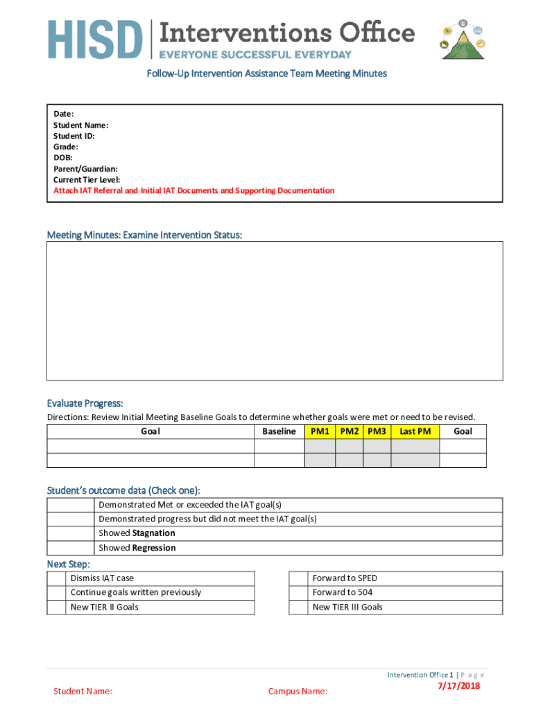 FollowUpInterventionAssistanceTeamMeetingMinutes Date: StudentName: Student ID: Grade: DOB: Parent/Guardian: CurrentTierLevel: AttachIATReferralandInitialIATDocumentsandSupportingDocumentationMeetingMinutes:ExamineInterventionStatus: