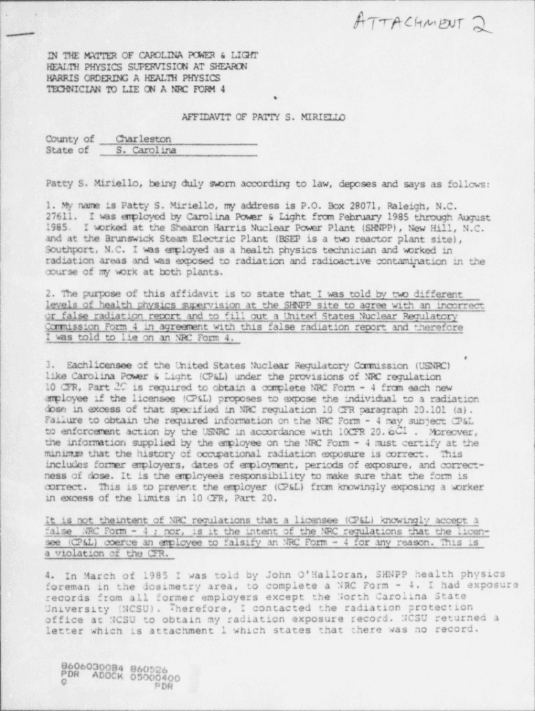 .\'&O1M Y#IN WE MATTER OF CAROLINA POWER & Life HEALTH PHYSICS SUPERVISION AT SHEAR HARRIS ORDERING A HEAL\'IH PHYSICSTEGNICIAN \'IO LIE ON A NRC FORM 4.AFFIDAVIT OF PATTY S. MILIEU county of01arlestonState