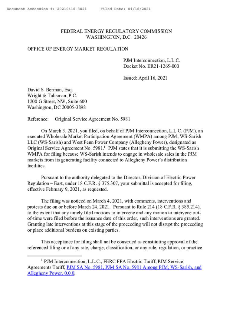 Document Accession #: 202104163021Filed Date: 04/16/2021FEDERAL ENERGY REGULATORY COMMISSION WASHINGTON, D.C. 20426 OFFICE OF ENERGY MARKET REGULATION PM Interconnection, L.L.C. Docket No. ER211265000