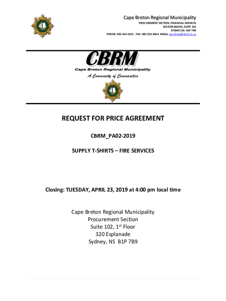 CapeBretonRegionalMunicipalityPROCUREMENTSECTION, FINANCIALSERVICES 320ESPLANADE,SUITE102 SYDNEY,NSB1P7B9 PHONE:9025635015FAX:9025399964EMAIL:purchase@cbrm.NS.CAA Community of Communities REQUESTFORPRICEAGREEMENT