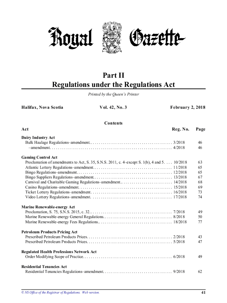 Part II Regulations under the Regulations Act Printed by the Queens Printer Halifax, Nova Scotia. 42, No. 3February 2, 2018Contents Acting. No. Page Dairy Industry Act Bulk Haulage Regulations amendment.