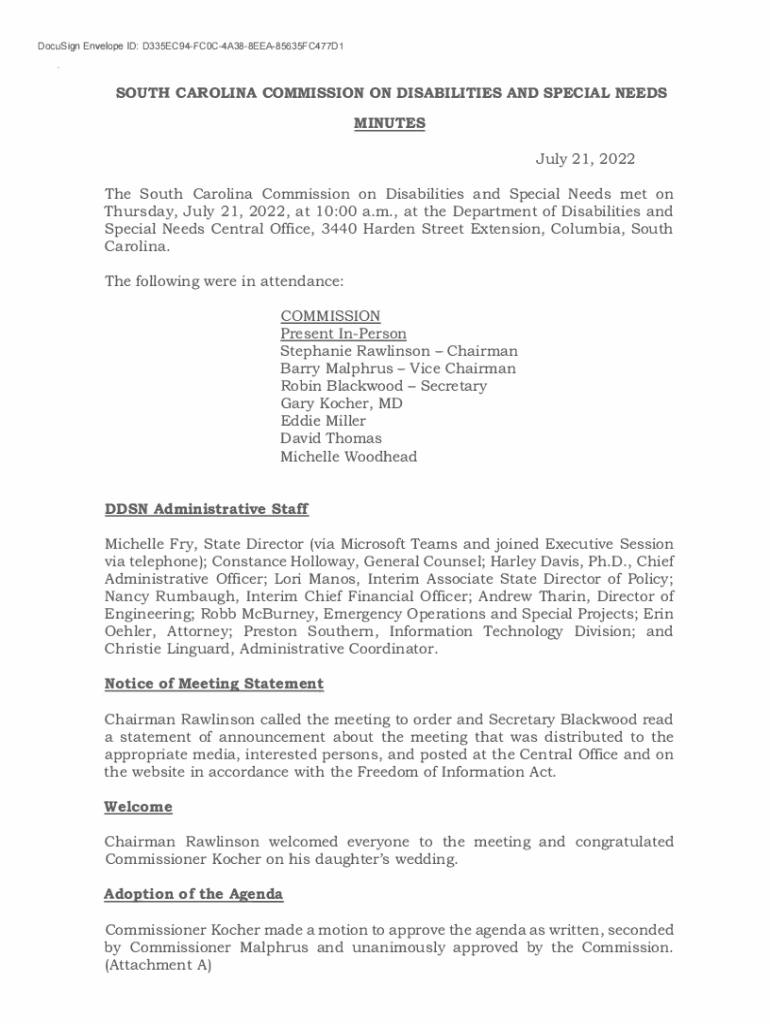 DocuSign Envelope ID: D335EC94FC0C4A388EEA85635FC477D1SOUTH CAROLINA COMMISSION ON DISABILITIES AND SPECIAL NEEDS MINUTES July 21, 2022, The South Carolina Commission on Disabilities and Special Needs