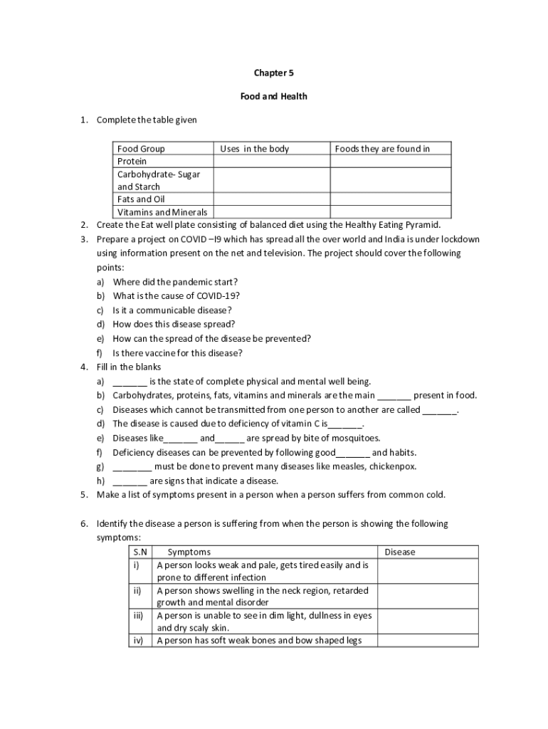 Chapter 5 Food and Health 1. Complete the table given2. 3.4.5. Food Group Uses in the body Foods they are found in Protein Carbohydrate Sugar and Starch Fats and Oil Vitamins and Minerals Create the